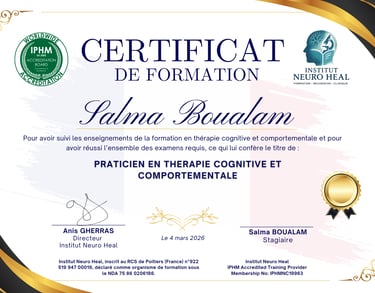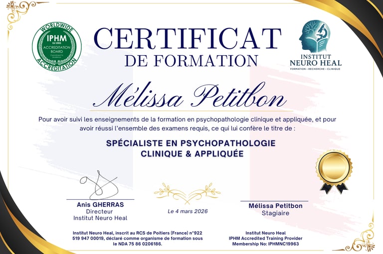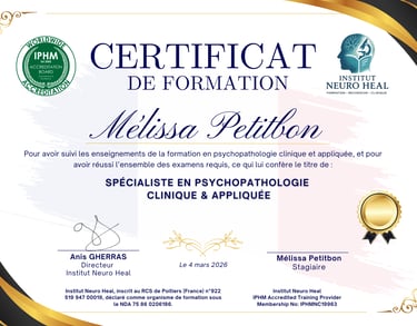 Une fois l’évaluation finale validée en ligne (questions ouvertes + cas clinique), vous obtiendrez une double certification : française et internationale accréditée par l’IPHM attestant de vos compétences dans la formation choisie.