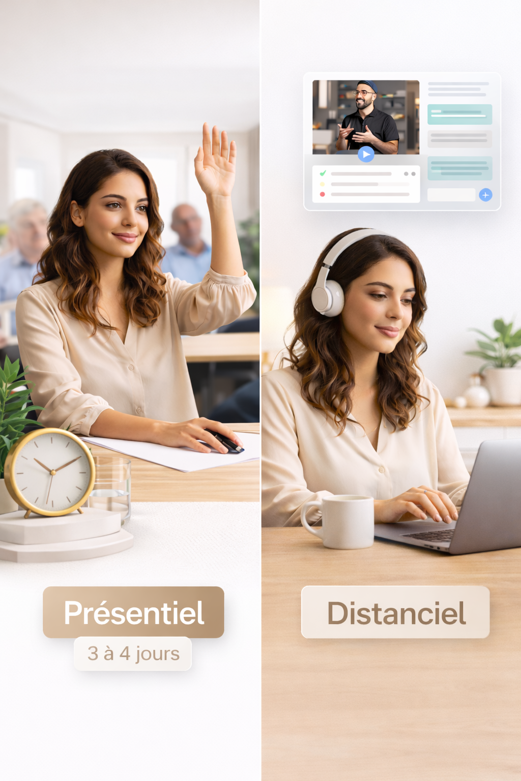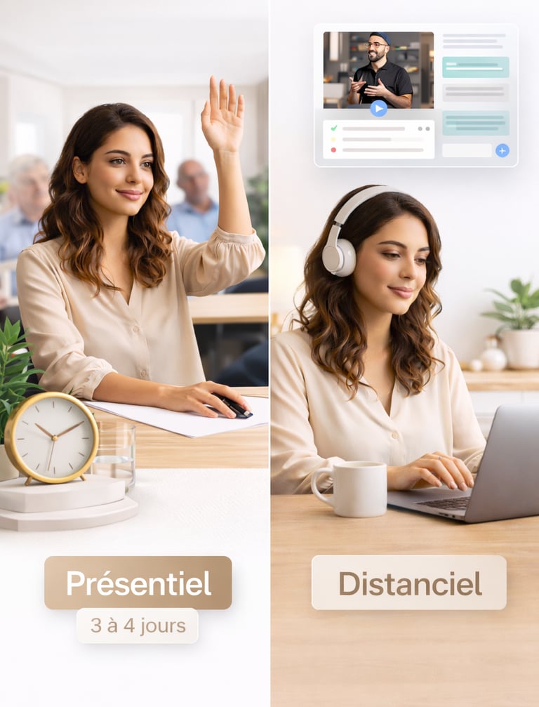 Format qui combine 3 à 4 jours intensifs en présentiel pour pratiquer